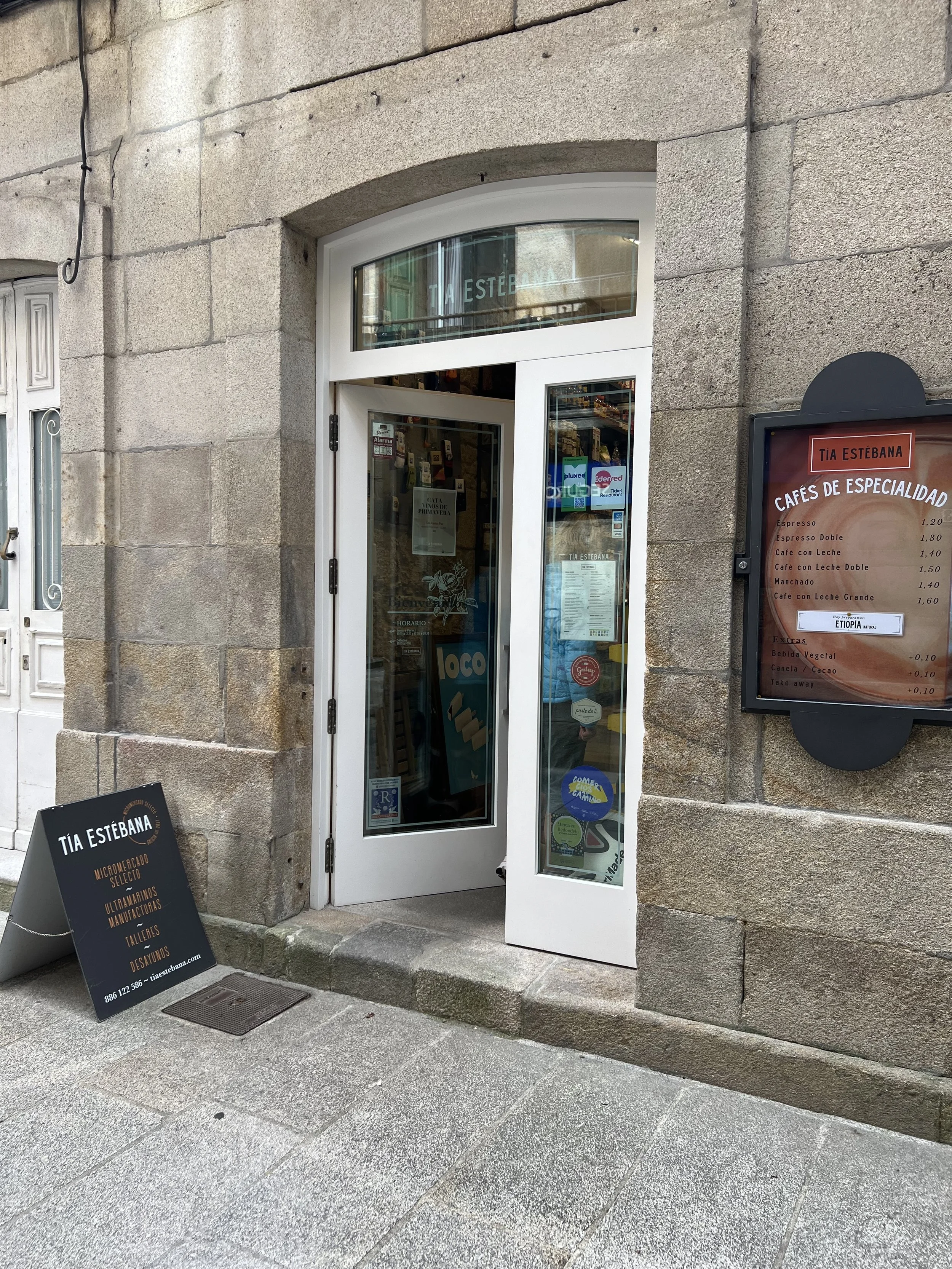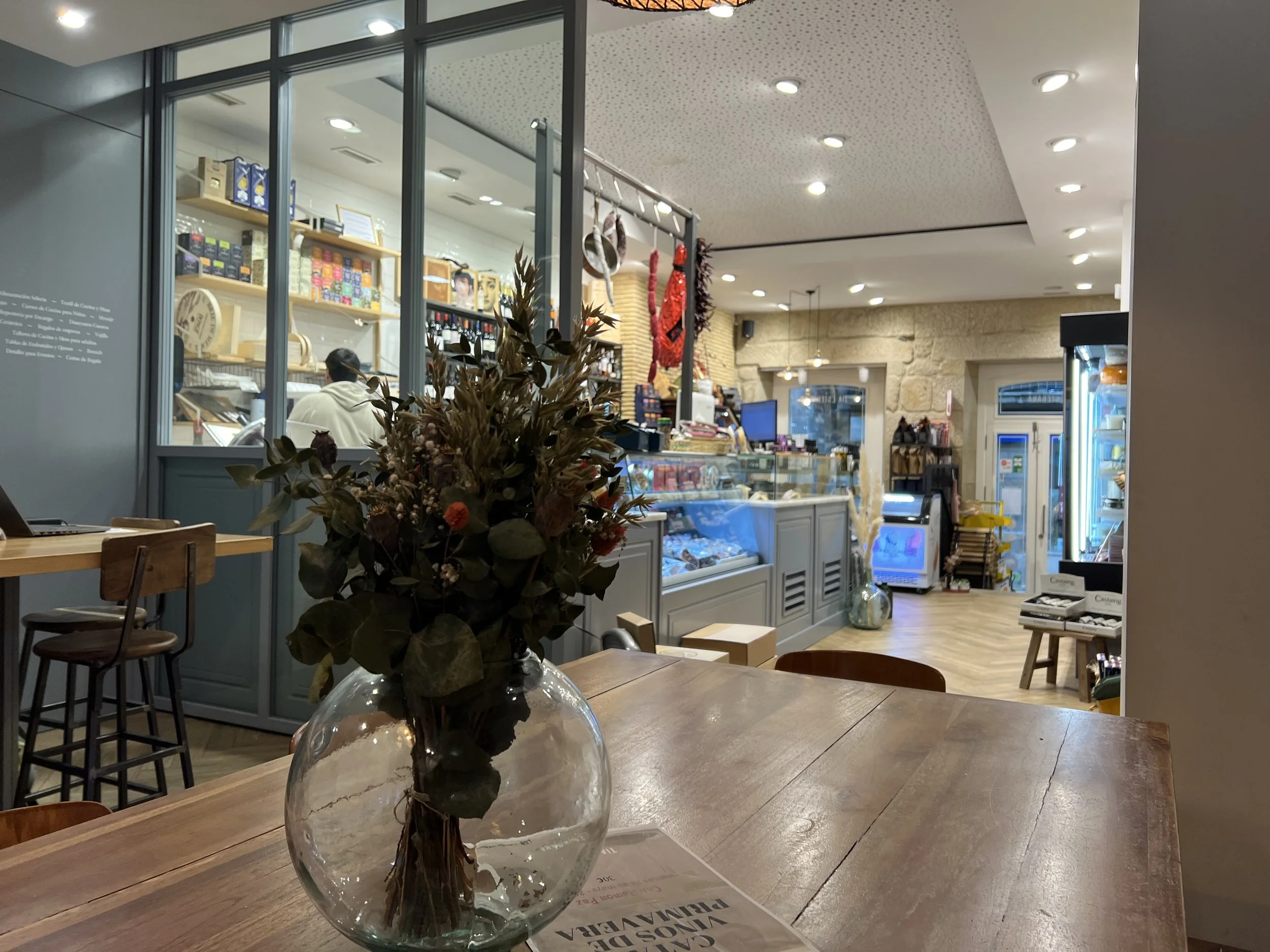 Meantime here in quaint Redondela, we arrived early - before our allowed check in times and we’re looking for our usual stopping / idling option - a sidewalk cafe. (Good coffee, other pilgrims, but honestly - another sweet roll?!?). Not today. I noticed a completely innocuous shop behind a modest glass door. Looking closer it appeared to feature charcuterie, but also had some public seating in the back so I ventured in. First thing I noticed was instead of the usual Spanish news or soccer blaring over some TV - their audio choice was jazz.