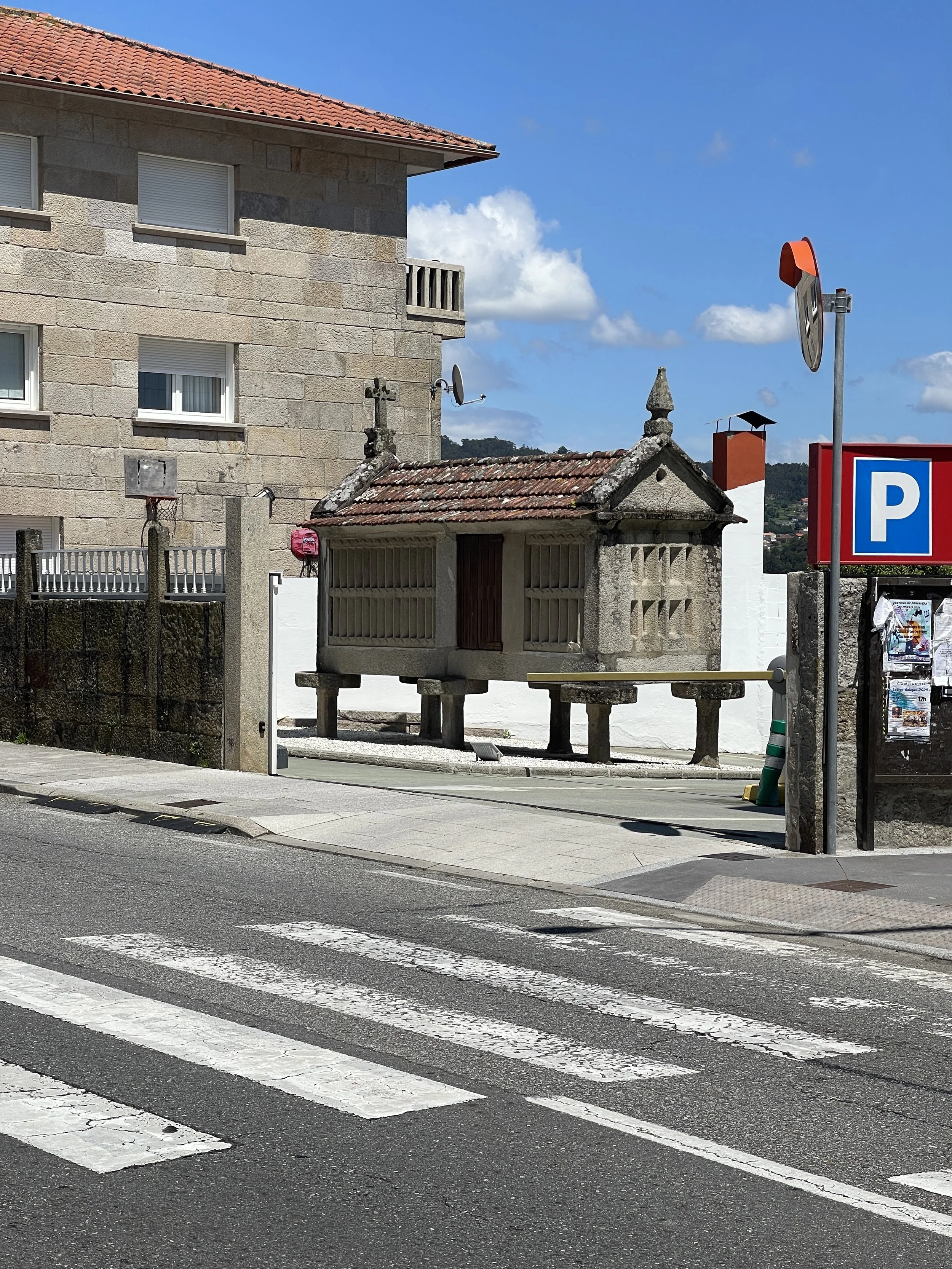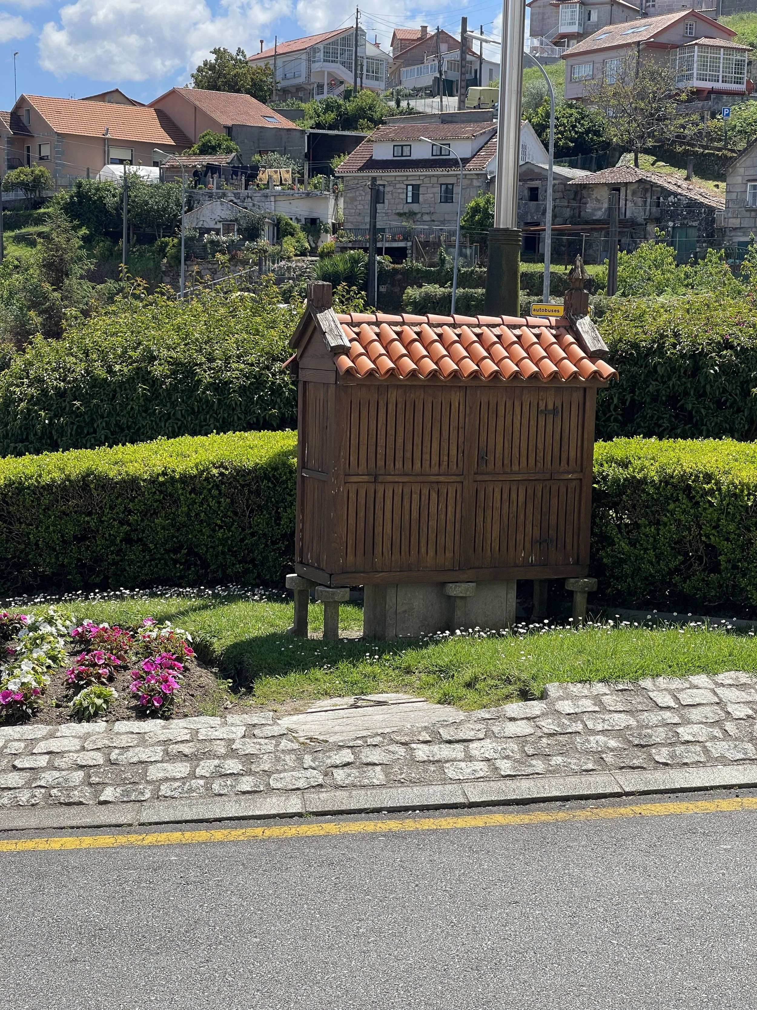 They are Hórreos (pronounced o·rre·os), and they are the traditional grain storage units of Galicia and Portugal. The crosses ask for holy blessing and protection of the contents, the thin slats allow wind to circulate through, but keep birds out, the roofs protect against moisture, but the most innovative feature are the pillar structures that both lift then off the ground AND prevent rodents from climbing up. These pedestals are called “esteous” in Galicia and “espigueiros“ in Portugal and feature a large round disc at the top which the rodents can’t get around without falling back to the ground. Ingenious.
